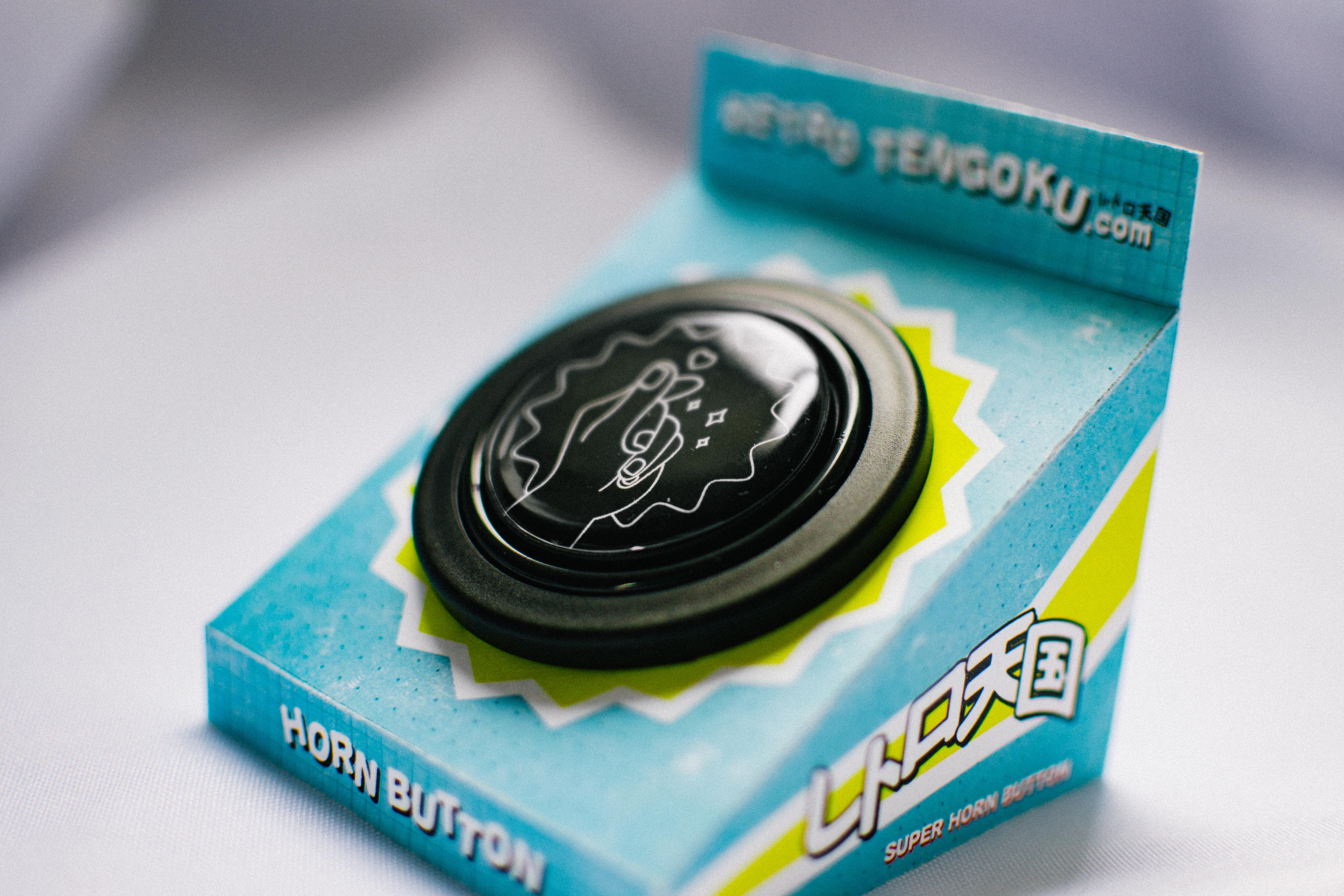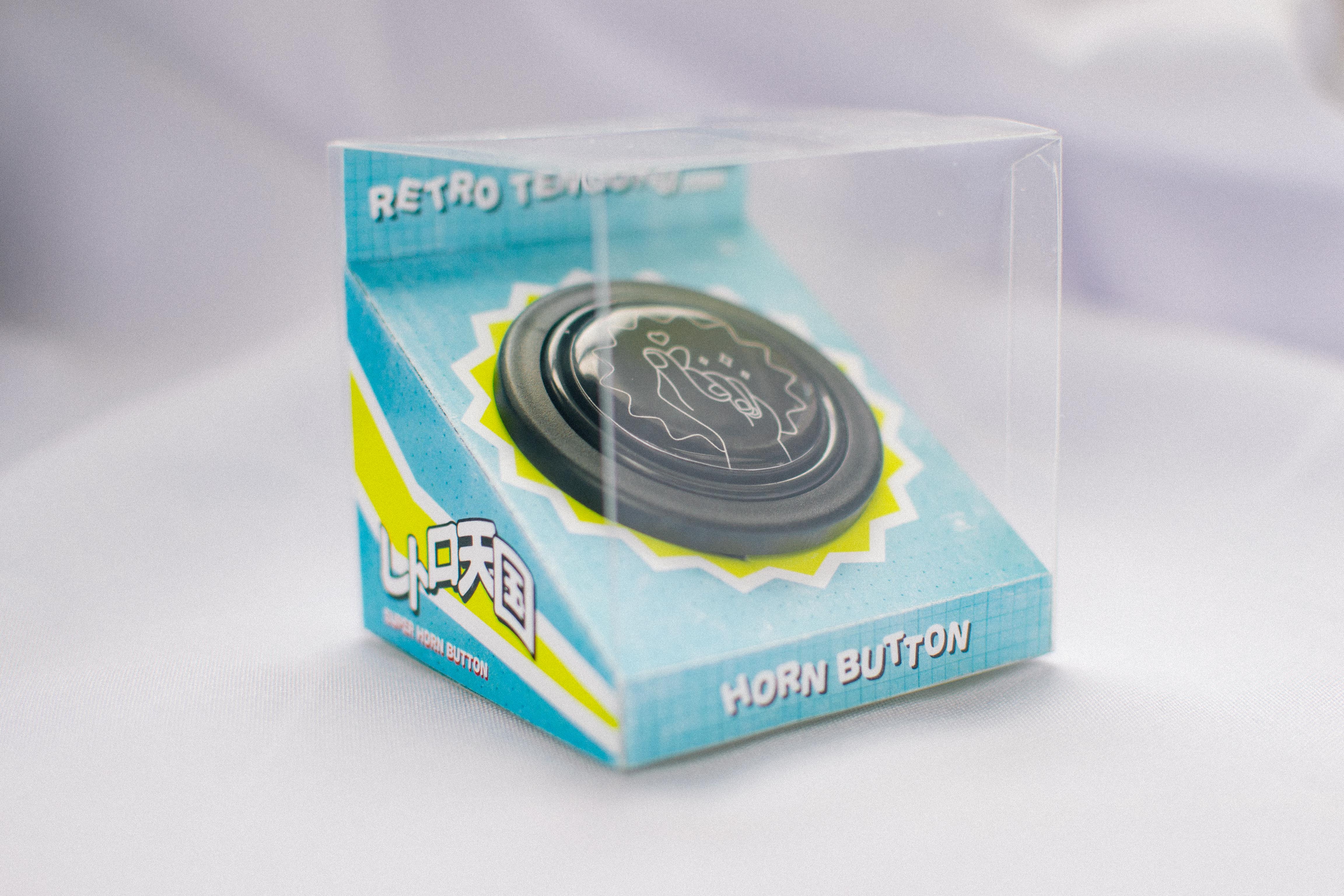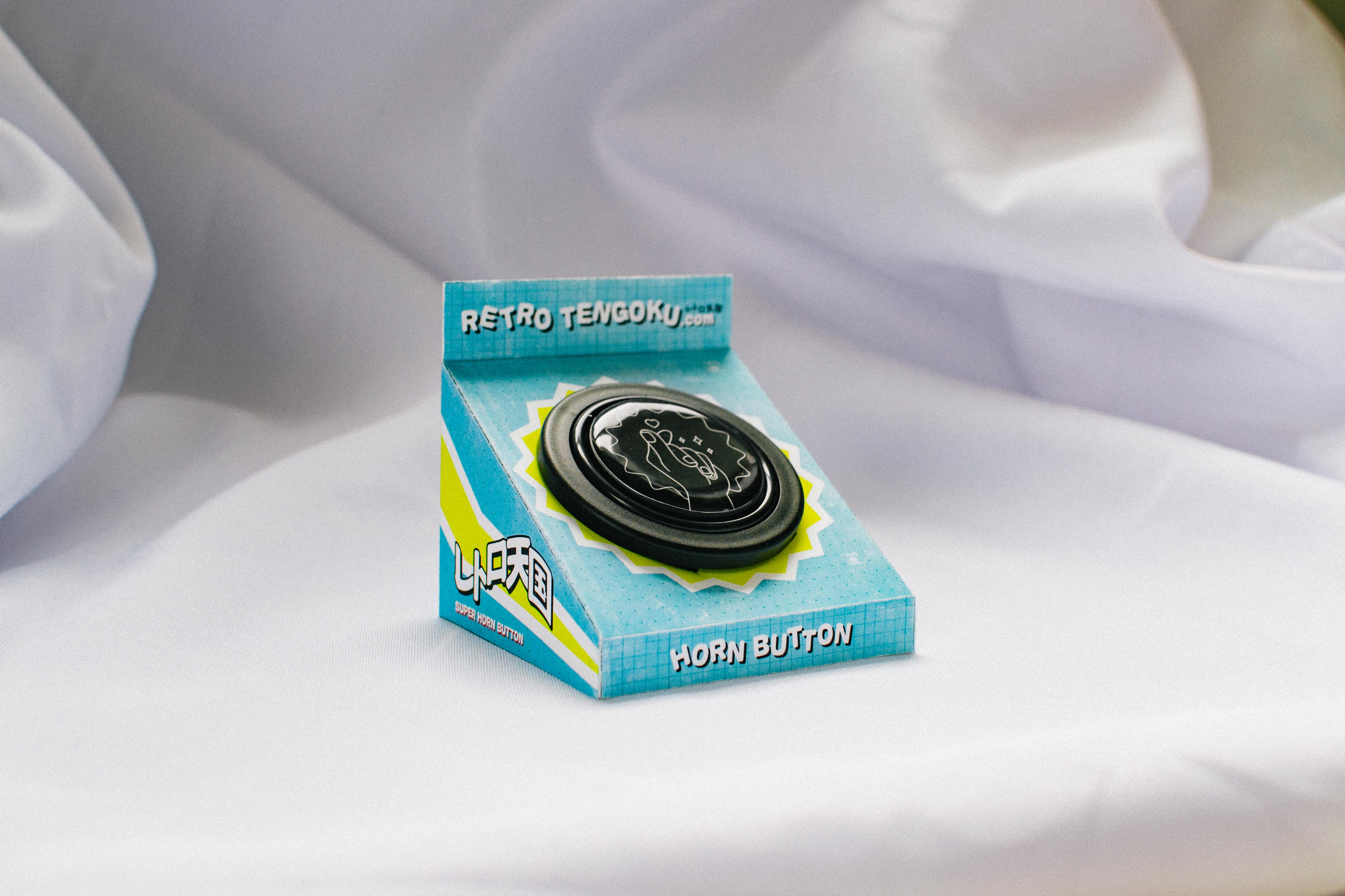 The first car accessory that the store has launched. Horn button is bought wholesale and the center dome is manufactured in-house. The packaging was designed to reflect 70s Japanese candy packaging with very bright colors and sharp angles.
