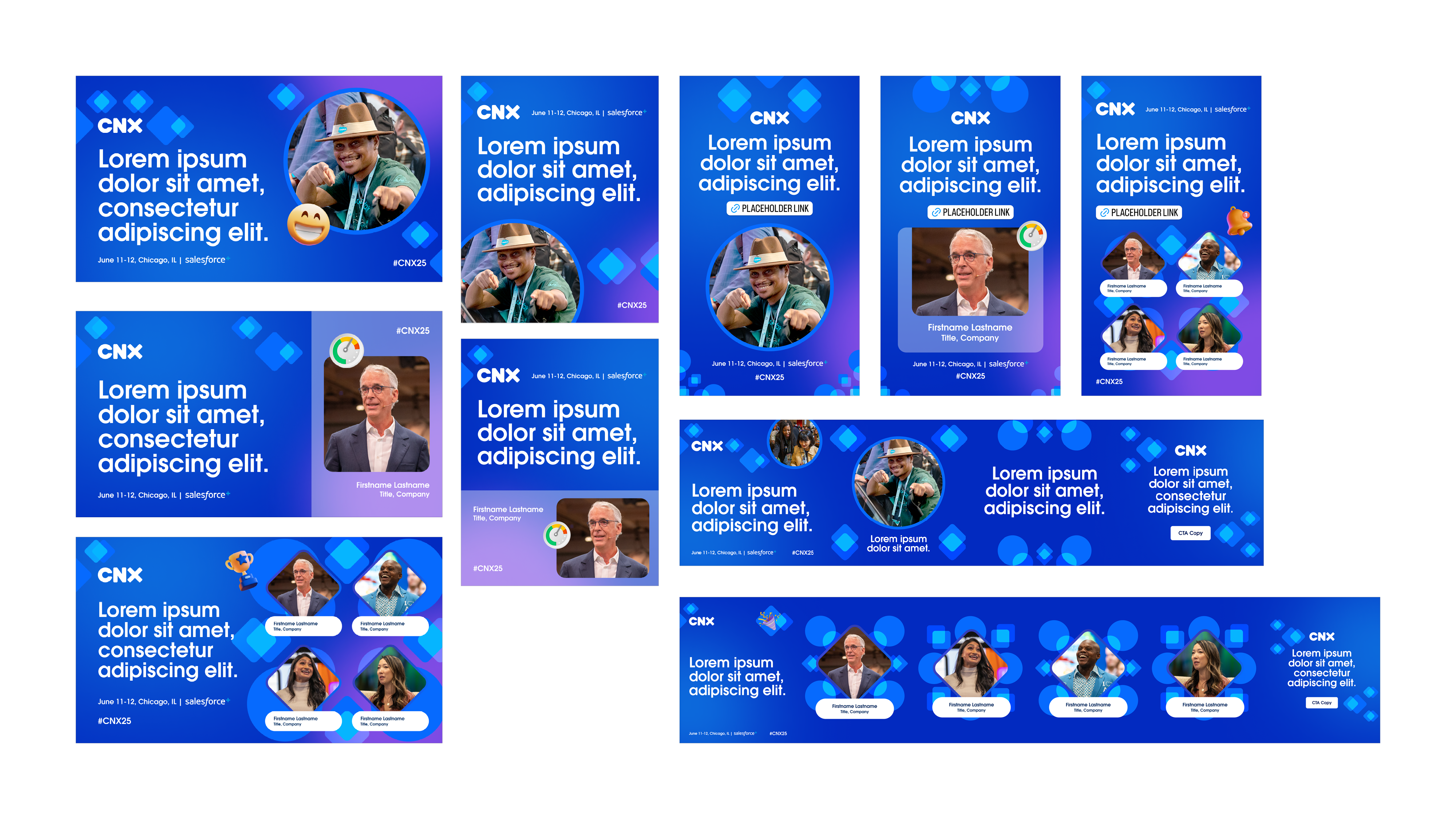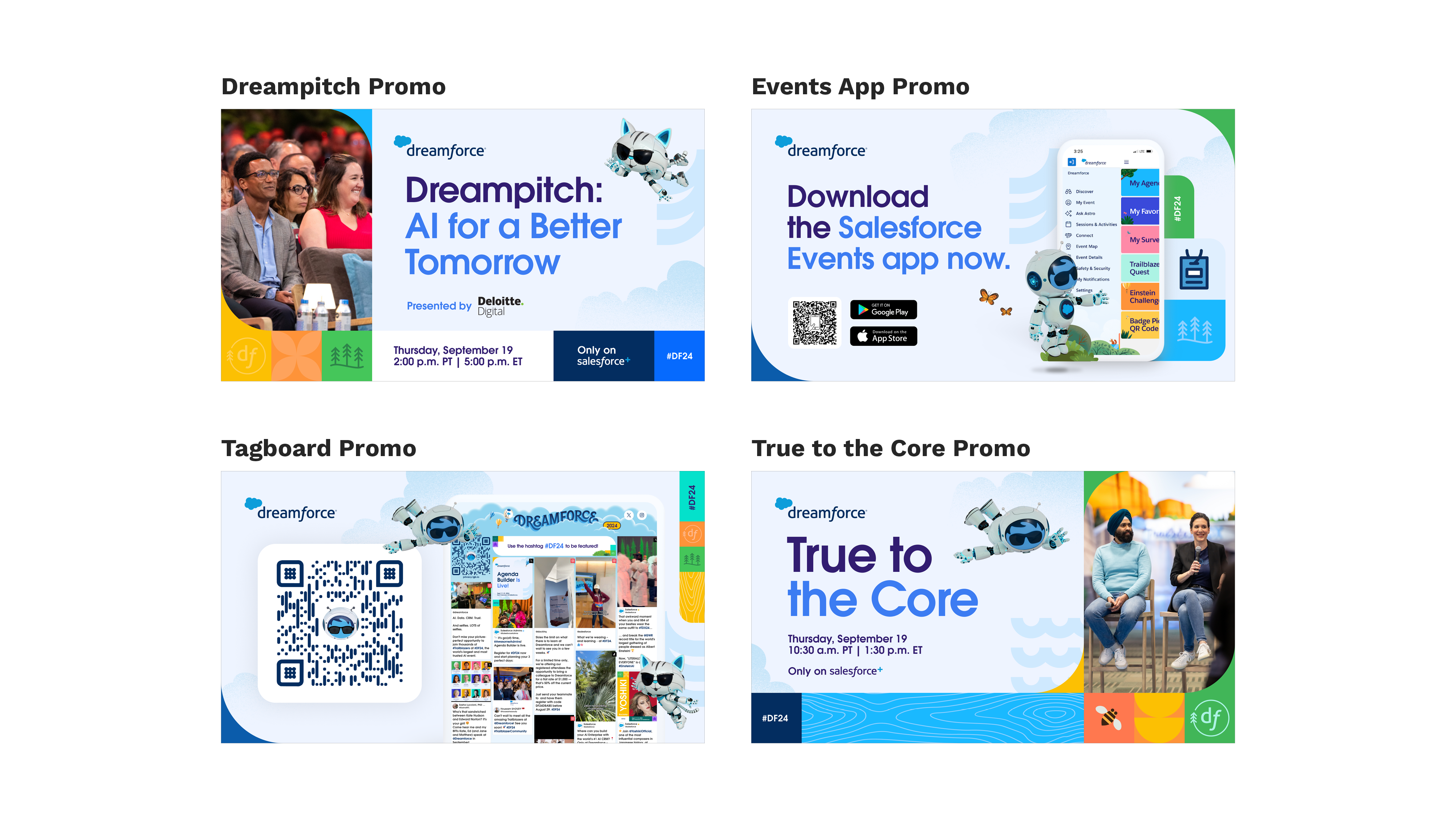 Through the months leading up to Dreamforce, different designers from different teams share and iterate their respective assets and end up building a massive portfolio of assets for Dreamforce that everyone riffs off from. I handled the design for almost all organic social assets from pre-event, during event, and post-event.