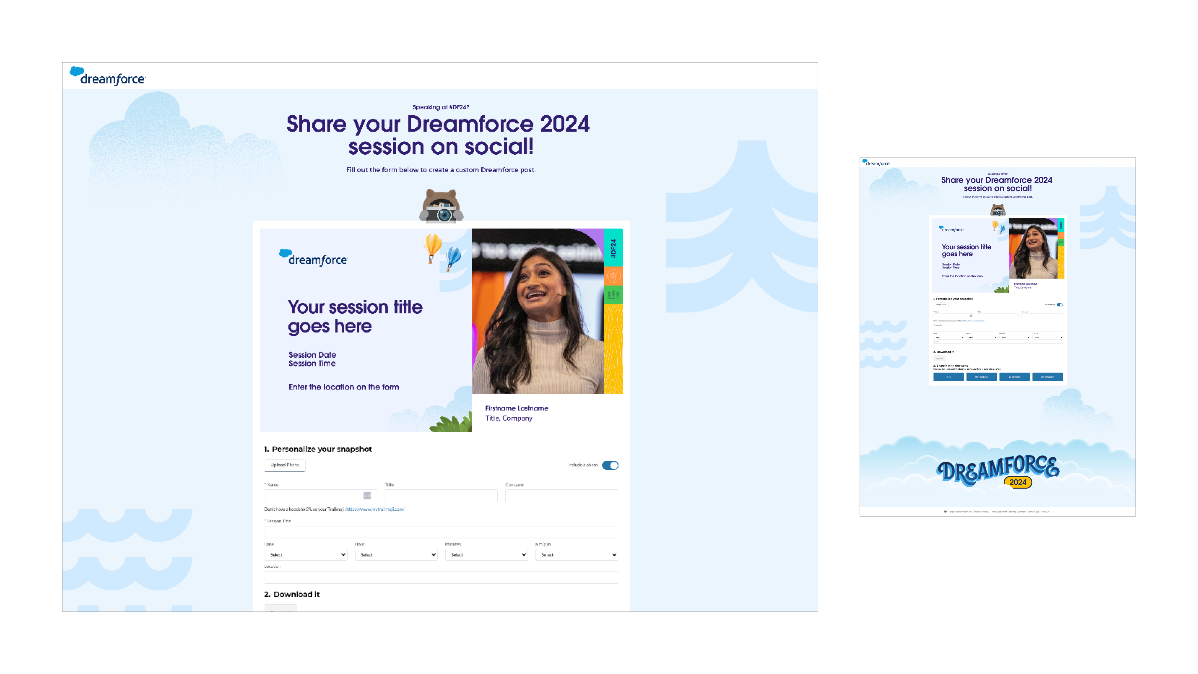 With all of Saleforce’s major events, we use Tagboard, it’s a social activation that shows up throughout the campground and on the livestreams. The way it works is that it showcases all social posts on X using the hashtag #DF24 and also from QR submissions. In previous events, we had a small graphic on the top left and the hashtag in the middle but we amped it up for Dreamforce. I created a background image and also a floating CTA for the app.